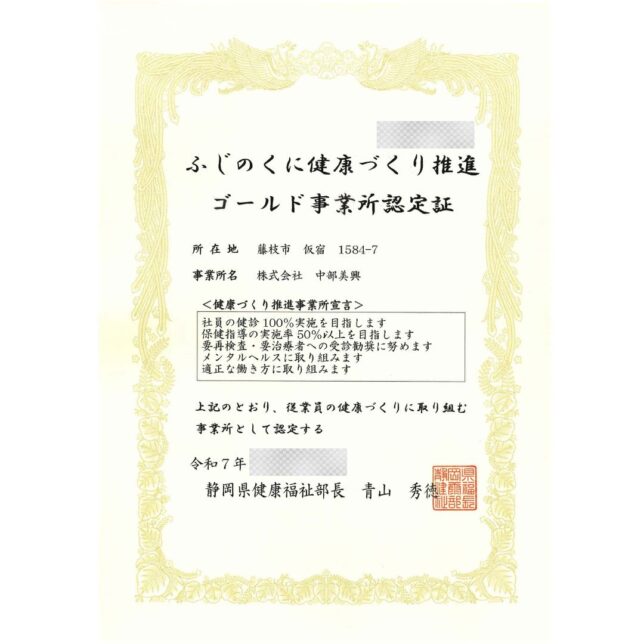 ふじのくに健康づくり推進ゴールド事業所に認定されました! 2025年7月4日 【ふじのくに健康づくり推進ゴールド事業所に認定されました】 このたび当社は、静岡県が推進する「ふじのくに健康づくり推進事業所認定制度」において、 「ゴールド事業所」の認定をいただきました。 本認定は、従業員の健康保持・増進に向けた取り組みを積極的に推進している事業所に対して 与えられるもので、今後も社員一人ひとりがいきいきと働ける職場づくりを目指し、 健康経営をより一層強化してまいります。